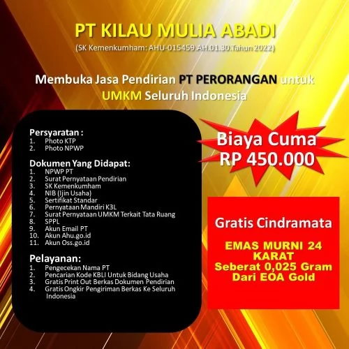 Setelah PENDIRIAN PT PERORANGAN selesai dan sukses, Anda berhak mendapatkan BONUS CINDRAMATA EMAS 24 karat seberat 0,025 gram sebagai ungkapan terima kasih kami.